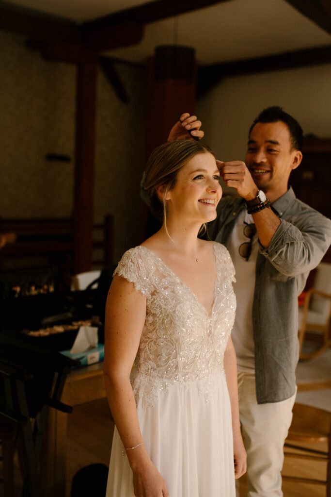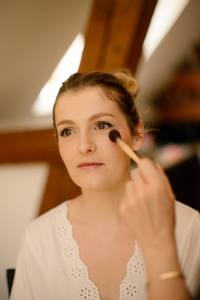 Maquillage discret dans les tons de gris. Paupières balayées d’un fard argenté et crayon anthracite en ras de cils. Bouche et joues roses
