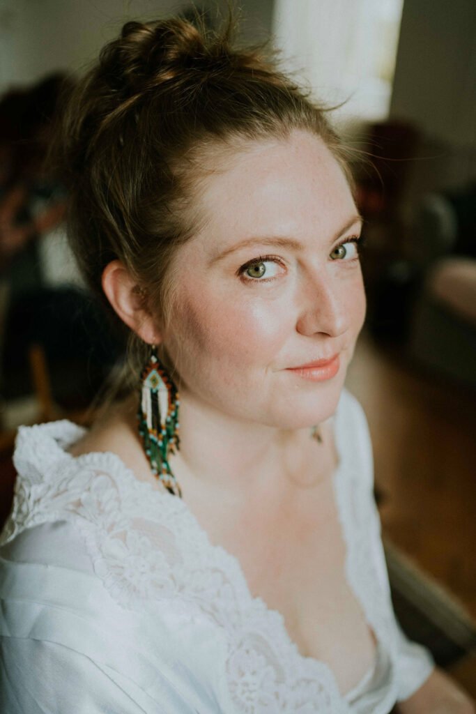 Maquillage tout en douceur privilégiant les tons rosées et abricotées pour un effet bonne mine naturel. Paupières satinées, soulignées d’un bord cils marron.
