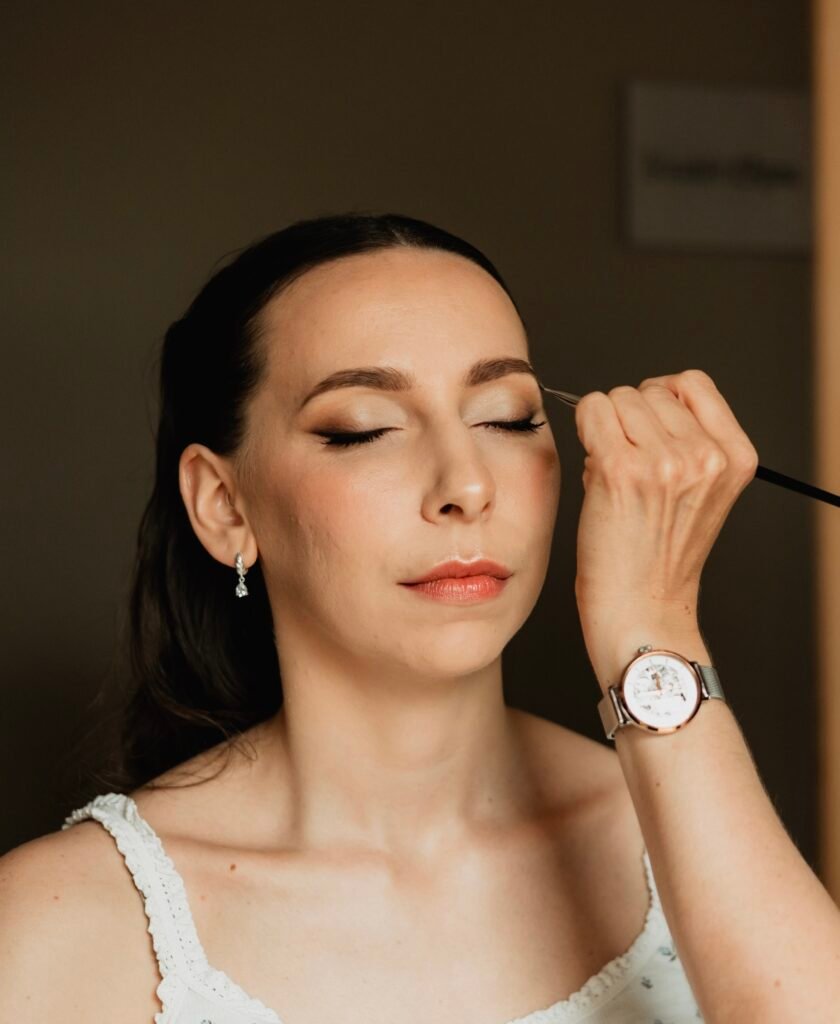 Paupières structurées avec un dégradé de fards mats. Ajout d’un eye liner et faux cils pour un regard encore plus défini. Bouche volontairement discrète, couleur en transparence