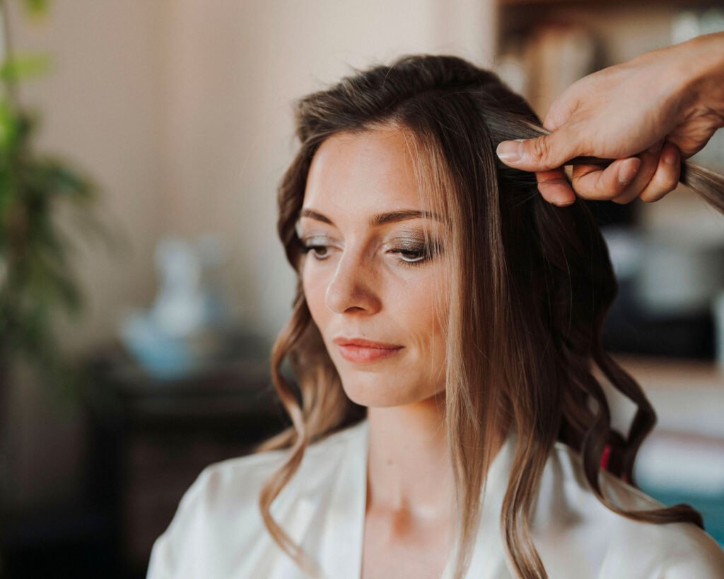 Paupières intensifiées avec un halo de fard gris irisé, crayon beige dans la muqueuse inférieure pour ouvrir le regard; bouche et joues discrètes afin de laisser place au léger smoky.