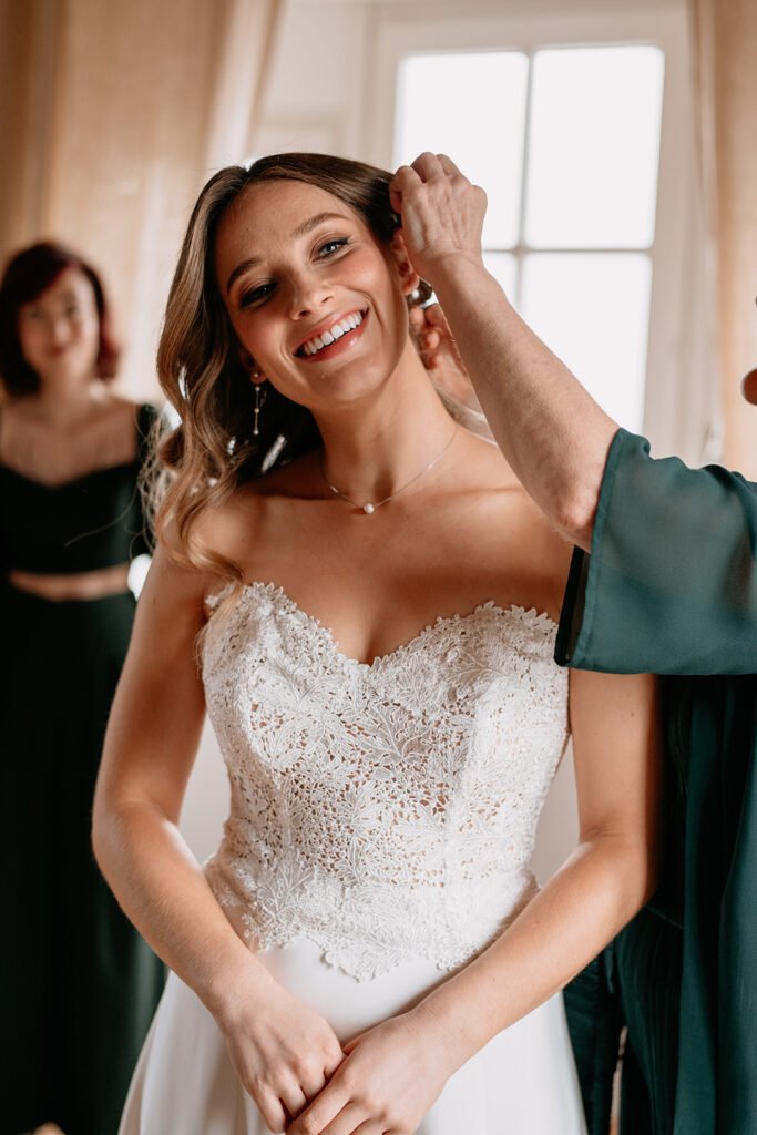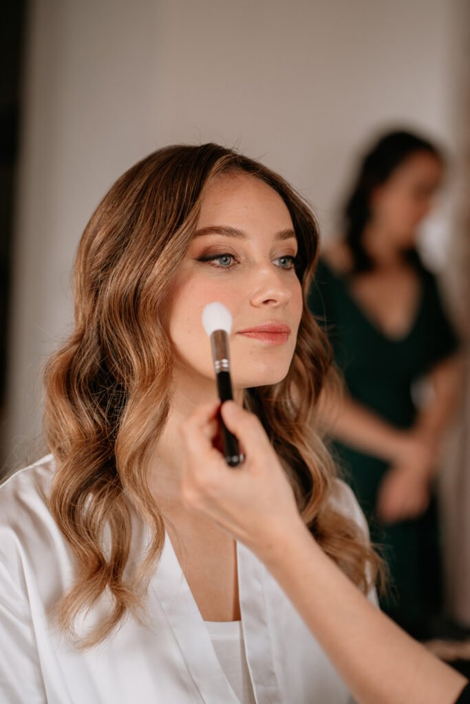 Paupières maquillées d’une nacre de couleur blanc cassé et de fards cuivrés. Regard intensifié grâce à un eye liner noir assumé. Bouche satinée couleur corail.