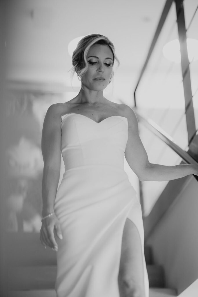 Paupières soutenues et satinées dans les tons de rose poudré et d’un fard taupe sombre. Regard réhaussé d’un eye liner noir et d’un bord cils inférieur. Joues structurées et bouche glossée avec le propre produit de ma mariée